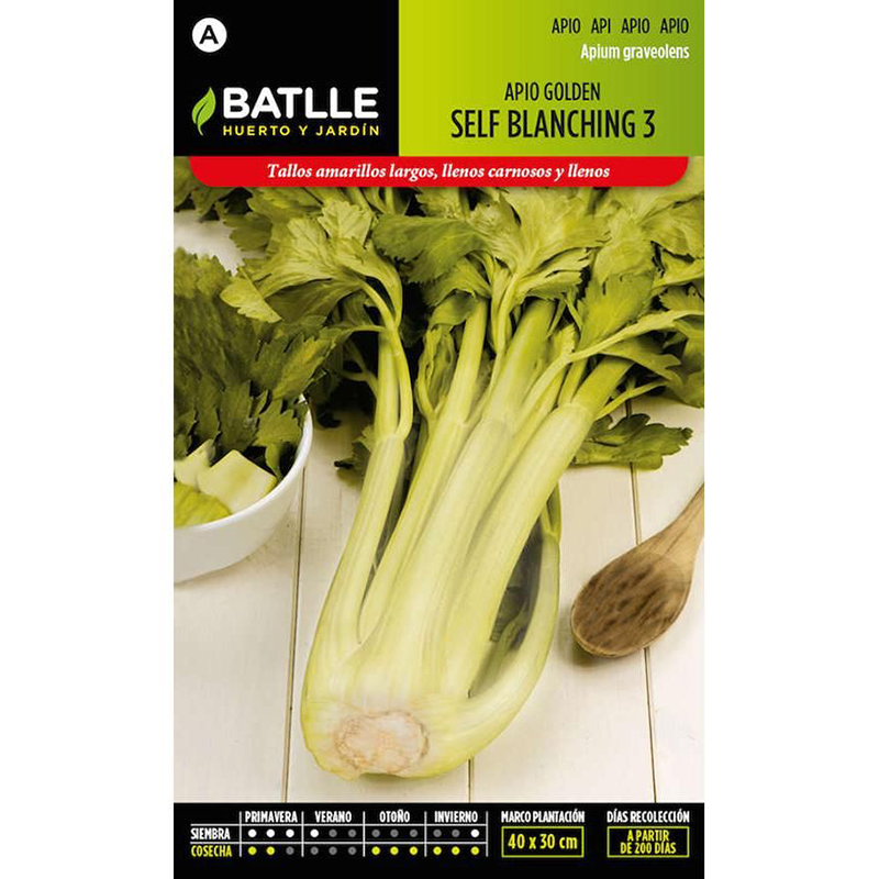 Variedad de hojas con disposición de color verde oscuro, estrechas y largas. Sobrepasando los 30 cms. Limbos partidos cubriendo el nervio central, que en su base toma un color violáceo. Para el blanqueo se atan de 15 a 20 días antes de la recolección. Sabor dulce. Siembra y recolección: Se siembra en Junio-Julio, para recolectar al final y principio de año. Peso neto : 3 g Nº de semillas en cada sobre :7.500 El Apio (Apium graveolens) pertenece a la familia de las Umbelíferas. Posee tallos estriados que forman una gruesa penca, blanca, carnosa y crujiente. Toda la planta tiene un fuerte sabor, aunque el blanqueo de los tallos en el cultivo hace que pierdan estas cualidades, adquiriendo un sabor más dulce y el característico aroma que lo convierte en un buen ingrediente de ensaladas y sopas. Se puede encontrar todo el año aunque los mejores se encuentran en otoño e invierno. Se distinguen dos tipos: Apio: Con peciolos carnosos que se llaman pencas. Apio-nabo: Peciolos poco desarrollados, pero forman un hinchamiento globoso y carnoso en las raíces. CONSEJOS GENERALES DEL CULTIVO DEL APIO Prefiere los suelos profundos, con abundante materia orgánica, y que no se encharquen. Los riegos deben ser continuados pero no excesivos. Es una especie que vegeta mejor con temperaturas suaves. Tiene escasa resistencia a las heladas y los excesivos calores paralizan su desarrollo Se multiplica por semilla, en semilleros, generalmente en bandejas para obtener plantas listas para trasplantar cuando tienen 4-5 hojas. De Septiembre a Febrero para la exportación y en Abril-Mayo para cosechar en Diciembre aprox, que es lo normal en el mercado interior. Se trasplante en hileras distanciadas 50-70 cm. y entre plantas 20-30 cm. Un mes antes de la recolección se puede recalzar a un tercio de la base para conseguir unas pencas más blancas, tiernas y dulces.