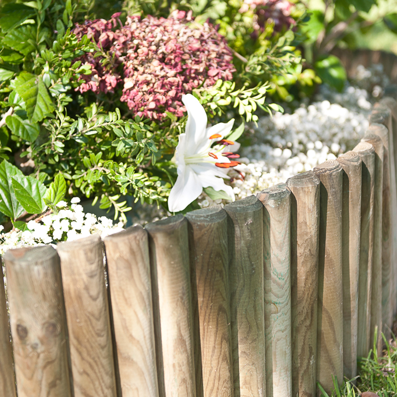 Las borduras de madera son una opción altamente decorativa para separar espacios ajardinados. Sin restringir la vista de las plantas, consiga una visión original de su jardín.