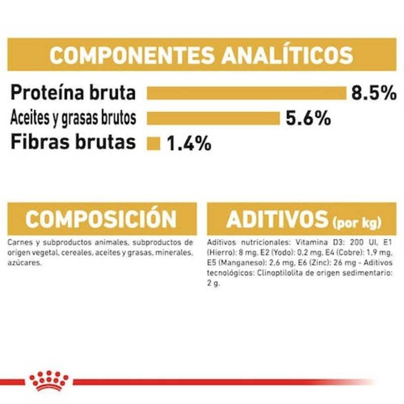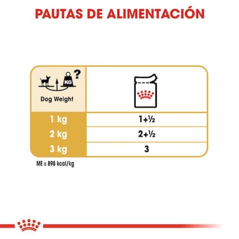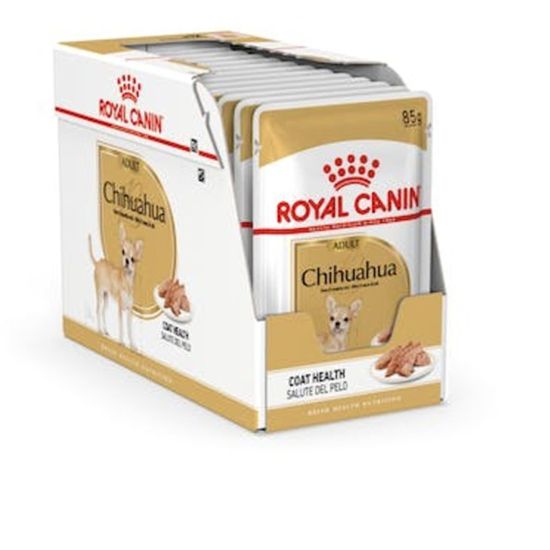 El paté Chihuahua de ROYAL CANIN® es apto para chihuahuas de más de 8 meses y ha sido especialmente formulado teniendo en cuenta las necesidades nutricionales de tu perro adulto. El paté Chihuahua de ROYAL CANIN® ha sido diseñado para favorecer un tránsito intestinal saludable. También contiene nutrientes que le proporcionan la alimentación necesaria para mantener la salud de la piel y del pelo de los perros de raza chihuahua. El paté Chihuahua de ROYAL CANIN® está formulado con una textura adaptada, capaz de aumentar la palatabilidad y satisfacer el apetito de los chihuahuas más exigentes. La suave textura del paté también es ideal para las mandíbulas de los perros de raza de tamaño mini, como los chihuahuas, ya que facilita la masticación y favorece un consumo y digestión óptimos. Para adaptarse a las preferencias individuales de cada perro, el paté Chihuahua de ROYAL CANIN® también está disponible en formato de alimento seco, con crujientes y sabrosas croquetas. Si deseas proporcionar a tu perro una alimentación mixta, sigue nuestras pautas de alimentación para garantizar que recibe la cantidad precisa de ambos alimentos para aprovechar todos sus beneficios.