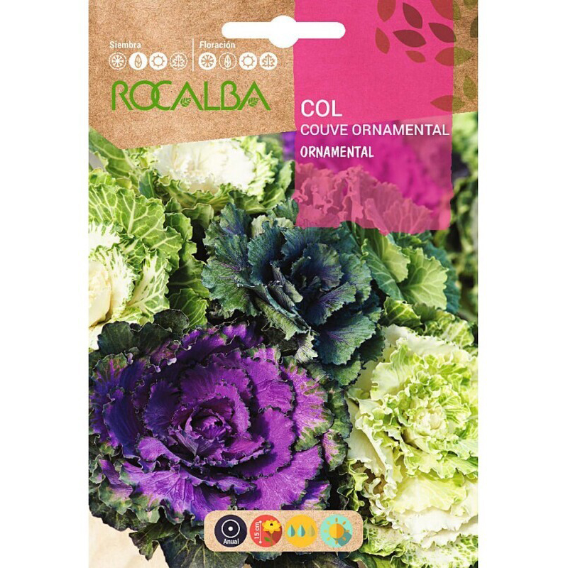 COL ORNAMENTAL VARIADA: Crucífera. Col que se caracteriza por tener las hojas centrales de color muy decorativo. Adecuada para inviernos donde otras plantas presentan problemas de resistencia al frío. Se utiliza para formación de grupos de color, platabandas, etc. Se cultiva en tierra normal de jardín. Clim: adaptación amplia.