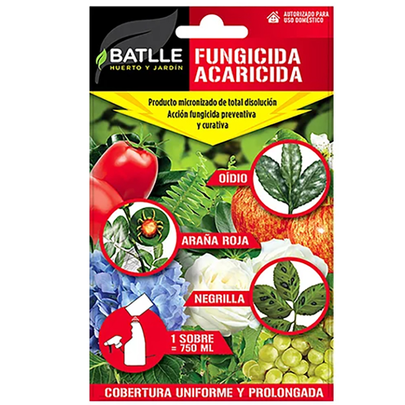 El Fungicida Acaricida BATLLE en sobre para 5 litros de producto, es un poderoso aliado en el control de plagas tanto de ácaros y eriófidos como de hongos perjudiciales para tus plantas. Con una acción eficaz por contacto directo ya distancia, este producto actúa como insecticida y fungicida, brindando una protección completa para tu jardín.