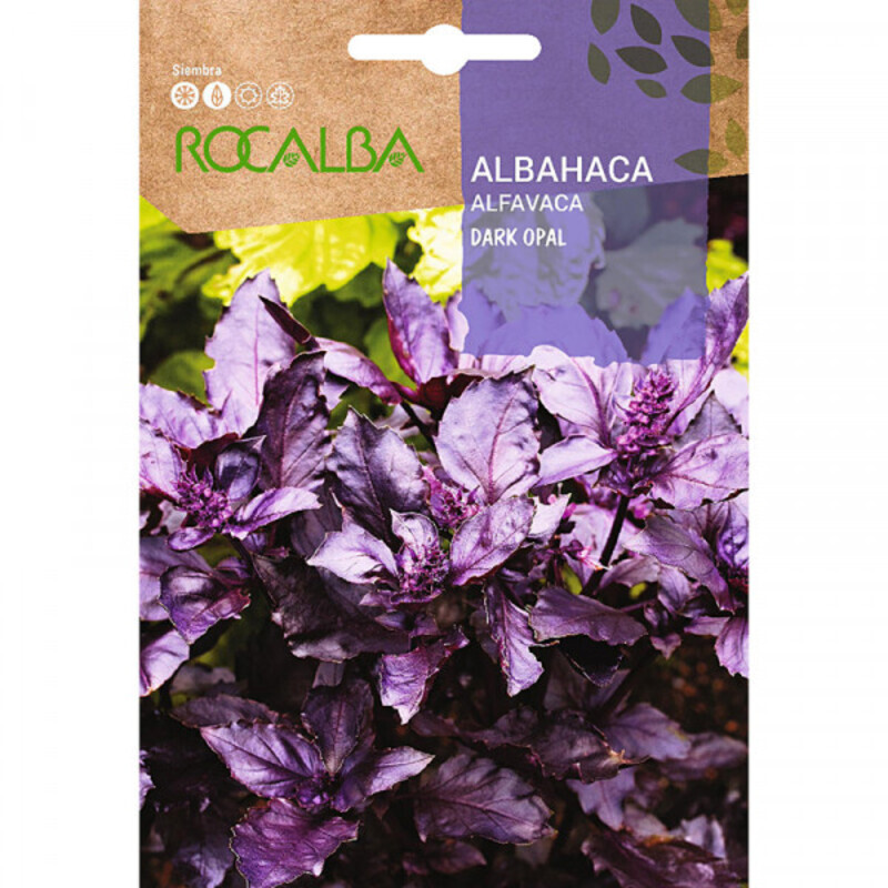 Sobre de semillas de Albahaca Dark Opal. Cada sobre contiene 4 g. Variedad de follaje purpura muy aromático. Planta anual de hoja grande. Floración de color rosa intenso. Plantar a una distancia de 40 cm entre hileras y a una distancia de 30 cm entre plantas. Llega a alcanzar 30-50 cm de altura Requiere suelo bien drenados con riegos frecuente y una exposición soleada Siembra en semillero de marzo a mayo Se puede trasplantar a partir de un mes de la siembra de abril a junio. Recolección de julio a noviembre.