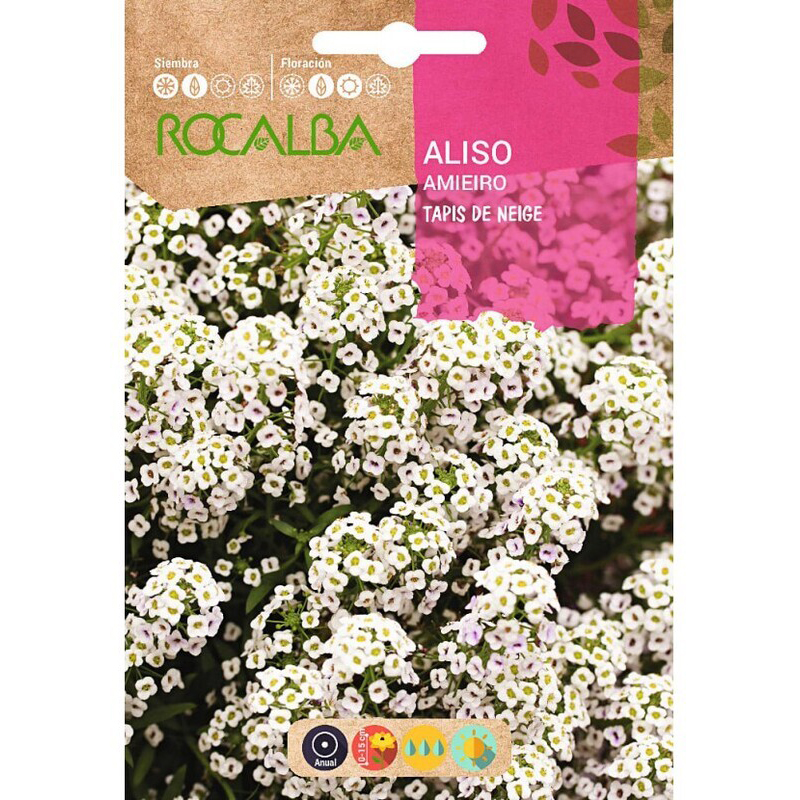 ALISO TAPIS DE NEIGE. Crucifera. Planta anual, de tallo leñoso en la base y hojas lineales. Flores reunidas en racimos, simples, cdompactos, de un blanco luminoso que da la impresion de un tapiz de nieve. Recomendada para borduras, plantabandas, canastillas, etc. Se cultiva en tierra permeable. Clima: adaptacion amplia
