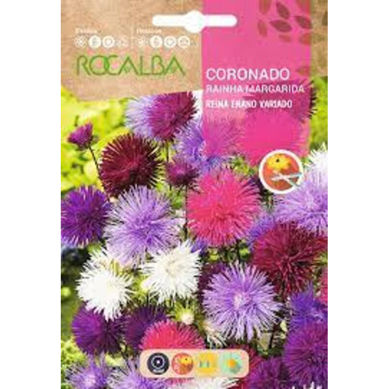 CORONADO REINA ENANO, VARIADO (ASTER SINENSIS): Compuestas. Planta herbácea anual de tallos erectos, recuniertos de flores. La floración es muy abundante y bastante precoz. Se utiliza en macetas, como flor cortada en la confección de pequeños ramos y en la formación de platabandas, bortduras, etc. Se cultiva en rierra de jardín ligera y permeable. Clima: adaptación amplia. Siembra: Primavera / Verano.
