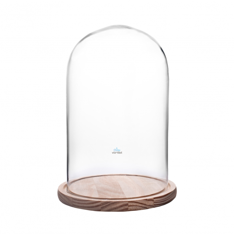 CÚPULA DE CRISTAL TRANSPARENTE CON BASE DE MADERA CON LEDS