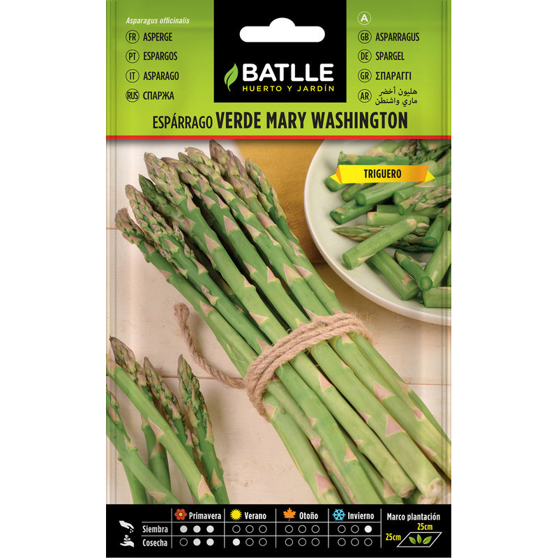 Variedad de espárrago que se utiliza tanto para espárragos blancos como verdes, obteniendo en este último caso una cabeza de color verde oscuro y muy bien cerrada. Cultivo: Se siembra de Febrero a Mayo en líneas separadas unos 20 cms o a voleo en semilleros. A fin de otoño se corta toda la vegetación a flor de tierra y en Invierno se arrancan las zarpas que están en disposición de ser trasplantadas al marco de 90X60 aprox. Recolección : Al 2º año se puede empezar a recolectar turiones largos y gruesos de color verde en el caso que no se realicen caballones. Peso neto : 5 gramos Nº de semillas en cada sobre: 200-250 El Espárrago (Asparagus officinalis) , pertenece a la familia de las Liliáceas. Originaria de las regiones de la cuenca del Mediterráneo. Es una planta vivaz que puede durar 10-12 años con buenos rendimientos. La parte comestible son unos brotes jóvenes, carnosos y tiernos -llamados turiones- que produce la planta. Cuando los brotes se recolectan antes de salir de la tierra, se denominan espárragos blancos, mientras que reciben el nombre de espárragos verdes cuando , debido a la función clorofílica de las plantas, se pigmentan de color verde. CONSEJOS GENERALES PARA EL CULTIVO DEL ESPARRAGO La multiplicación del espárrago puede hacerse vegetativamente (zarpas), o por semillas. En la multiplicación por semilla, es necesario pasar por la fase de semillero. Se necesitan 1 kg. para sembrar una Ha, en líneas separadas 30-45 cm. y 6-7 cm. entre semillas. En plantaciones extensivas puede utilizarse la siembra directa. Una vez formadas las plantas, el año siguiente se trasplantan las zarpas a unos 2 m. entre líneas y 30 cm. entre plantas. Caben alrededor de 10.000-12.000 plantas/Ha. Al año siguiente podremos empezar a recolectar turiones de espárrago. Escoger variedades adecuadas según queramos obtener espárragos blancos o verdes. Hay que elegir parcelas de textura ligera para que los espárragos salgan mejor formados.