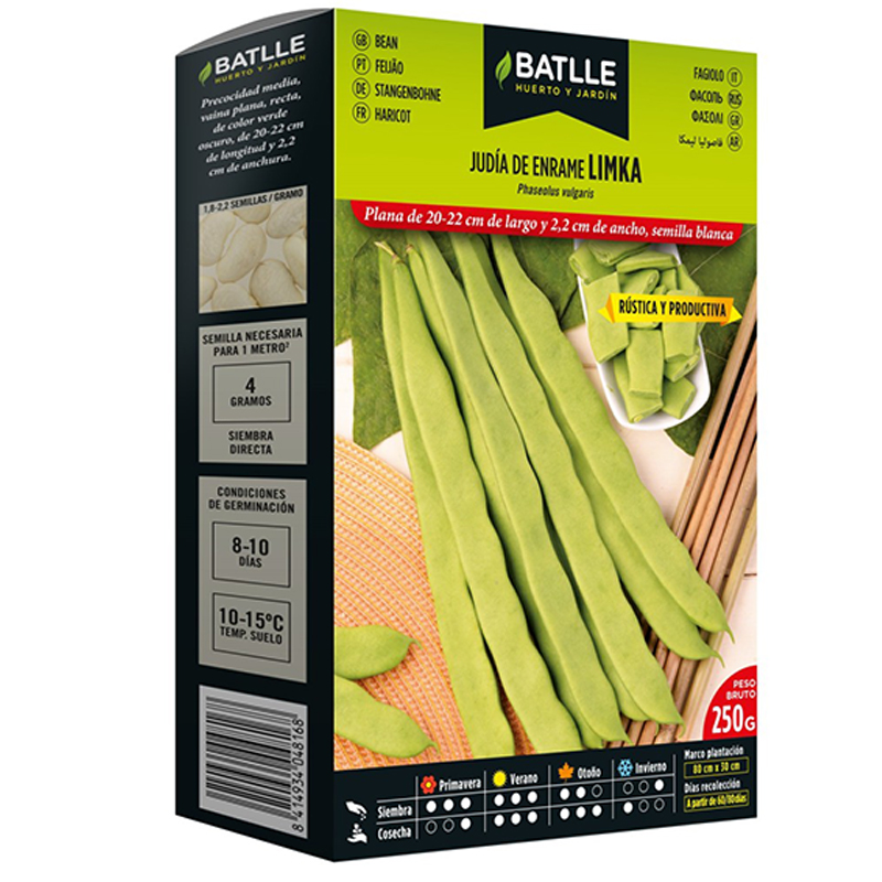 Variedad de medios, precocidad rústica, vigorosa y de gran adaptabilidad. Producción escalada. Vaina plana, recta de color verde oscuro de 20-22 cm de largo y 2 cm de ancho. Semilla blanca. Virus del mosaico del frijol común resistente. Recomendado para tres cosechas anuales. Forma de cultivo: Desde febrero se puede plantar hasta septiembre. Requerido para germinación por encima de 10°C y humedad. Siembre de 2 a 4 plántulas a una profundidad de 3 centímetros. y en marco de 75x30cm. También se puede sembrar con sembradora de precisión de 10 cm y 70-80 cm entre hileras. Se puede recolectar 60 días después de la siembra, según áreas. Peso neto: 25g Las judías trepadoras son judías postizas que superan los dos metros de longitud, se cultivan habitualmente tanto en jardines como en invernaderos. Se consideran judías verdes, se utilizan para el consumo en verde, utilizándose no sólo las semillas (poco cuajadas) sino también la vaina donde se encuentran. Es un género Plantra Fabaceae, subespecie Papilonaceae, familia de las leguminosas, manual, de vegetación rápida. . Su sistema radicular es muy ligero y poco profundo, formado por una raíz principal y un gran número de raíces secundarias con un alto grado de ramificación, con un tallo principal herbáceo. Tiene una punta de lanza simple en forma de hoja, cuyo tamaño varía según la variedad de frijol. La flor puede tener diferentes colores, específicos de cada variedad, aunque normalmente será blanca. El frijol es una leguminosa de gran importancia en la alimentación humana, por su doble uso, en verde y como grano y su alto consumo proteico, otro punto de interés es que las leguminosas entran a sus raíces en simbiosis con la bacteria Rhizobium, bacteria que son capaces de fijar nitrógeno. desde el aire.