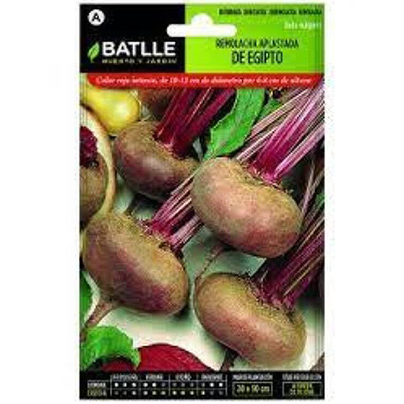 Remolacha de mesa Aplastada de Egipto Variedad de buena precocidad de raíz de color rojo muy intenso. Alcanza de 10 a 12 cms. de diámetro y de 6 a 8 cms. de altura. Carne dura y dulzona. Forma de cultivo : Se siembra todo el año con preferencia en Primavera y Verano, según climas, directamente de asiento, bien a voleo o en líneas espaciadas a 40 cms., aclarando las plantas a unos 20 cms. de distancia entre si. Bastante resistente al frío y al calor. Recolección : A los 3 o 4 meses de su siembra. Peso neto: 10 gramos Nº de semillas por sobre: 500 La remolacha (Beta vulgaris) es una planta de la familia Chenopodiaceas. Se aprovecha las raíces principalmente y también las hojas. Las variedades de mesa son de raíces gruesas, rojas y carnosas, que se consumen principalmente cocidas. Morfológicamente son redondas, aplastadas y alargadas. Tienen un color rojo muy fuerte que se debe a dos pigmentos, la betacianina y la betaxantina. Se usa frecuentemente como colorante en productos alimentarios. Es de fácil cultivo. CONSEJOS GENERALES PARA EL CULTIVO DE LA REMOLACHA mbramos semilla multigermen, es aconsejable aclarar las plántulas para conseguir raíces de mejor tamaño y uniformes. Recolección en Otoño-invierno normalmente.