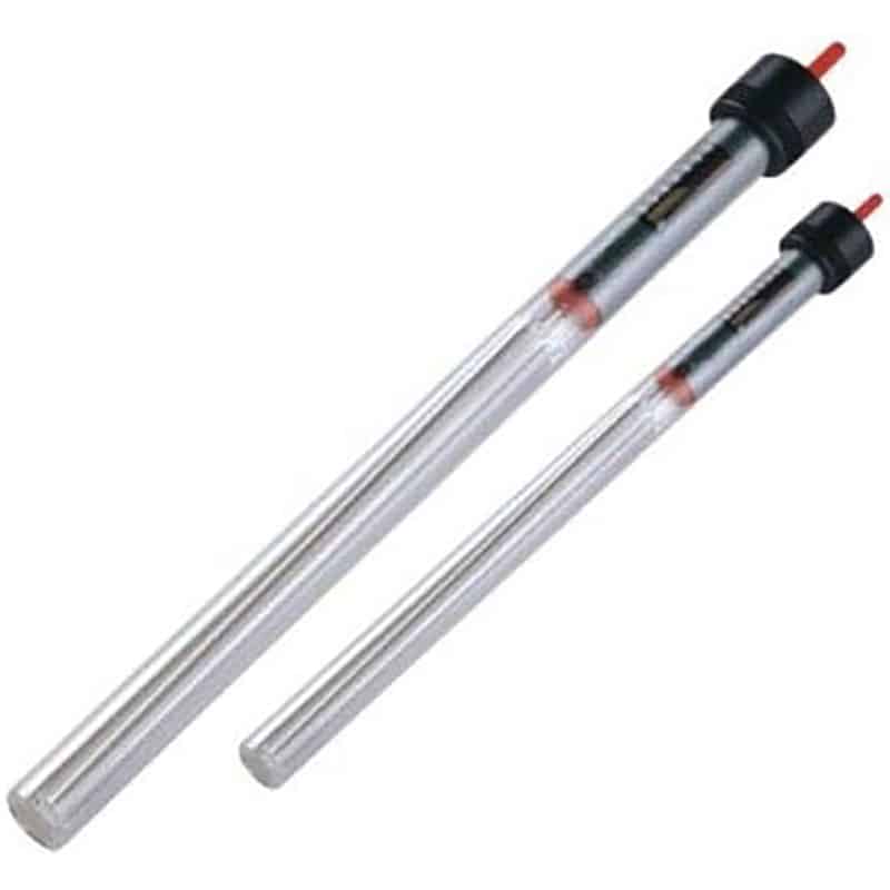 Calentador de acuario. Termostato integrado con indicador de luz de calefacción. Esfera de control de temperatura (ajustable entre 18 y 34 °). Calentador de cristal totalmente sumergible con bobina de calefacción helicoidal de níquel cromado.