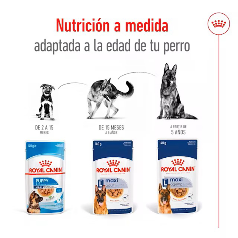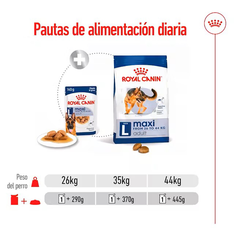 ROYAL CANIN® Maxi Adult trocitos en salsa también está disponible en alimento seco: ROYAL CANIN® Maxi Adult. Combinar alimentos húmedos y secos aporta variedad a la alimentación de tu perro, haciendo que las comidas sean más interesantes y atractivas.