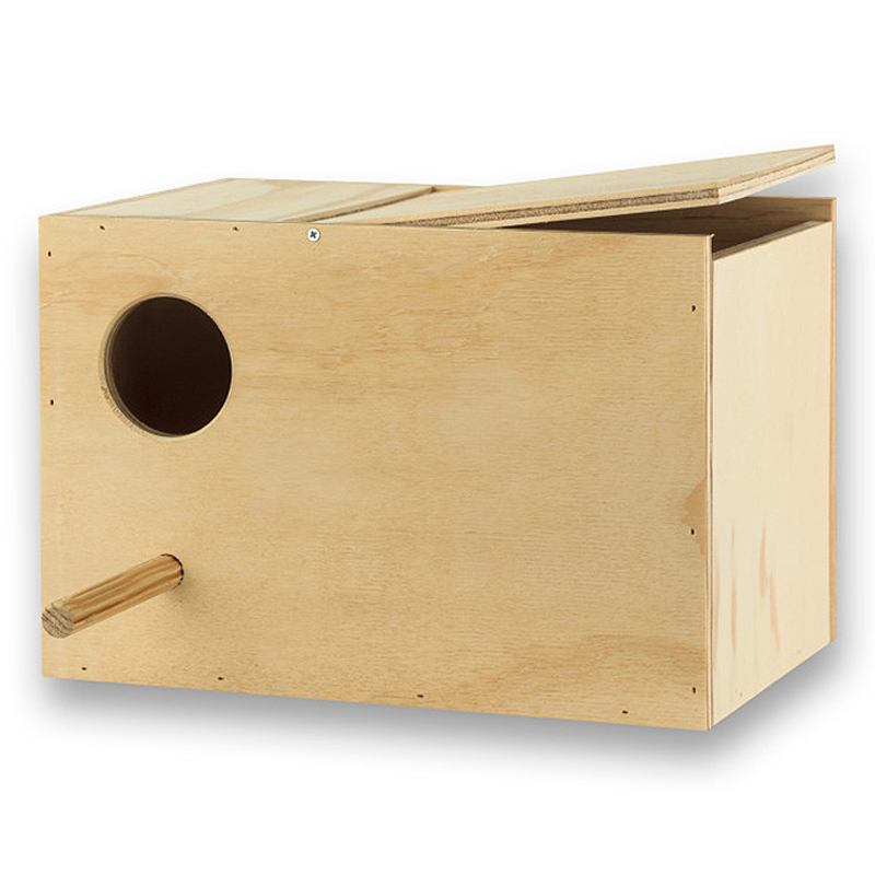 Nido de madera grande para ninfa/cacatúa carolina, formato horizontal, medidas 30 × 20 × 20 cm. Ideal para cría o refugio en jaula/voladera.