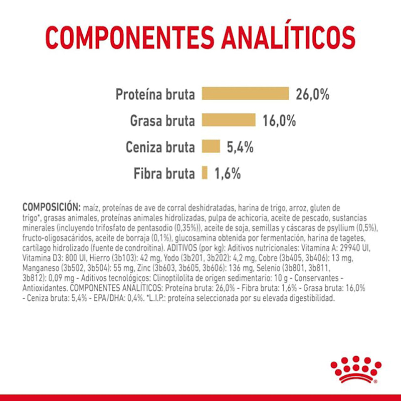 Composición: maíz, proteínas de ave de corral deshidratadas, harina de trigo, arroz, gluten de trigo*, grasas animales, proteínas animales hidrolizadas, pulpa de achicoria, aceite de pescado, sustancias minerales (incluyendo trifosfato de pentasodio (0,35%)), aceite de soja, semillas y cáscaras de psyllium (0,5%), fructo-oligosacáridos, aceite de borraja (0,1%), glucosamina obtenida por fermentación, harina de tagetes, cartílago hidrolizado (fuente de condroitina).