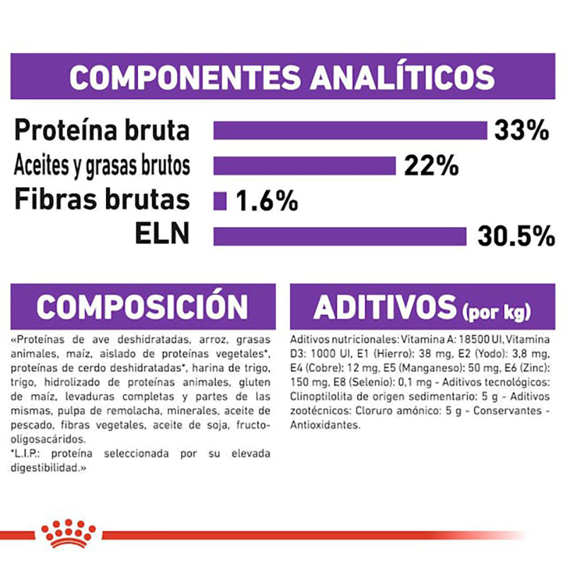 Composición: proteínas de ave deshidratadas, arroz, grasas animales, maíz, aislado de proteínas vegetales*, proteínas de cerdo deshidratadas*, harina de trigo, trigo, hidrolizado de proteínas animales, gluten de maíz, levaduras completas y partes de las mismas, pulpa de remolacha, minerales, aceite de pescado, fibras vegetales, aceite de soja, fructo-oligosacáridos.