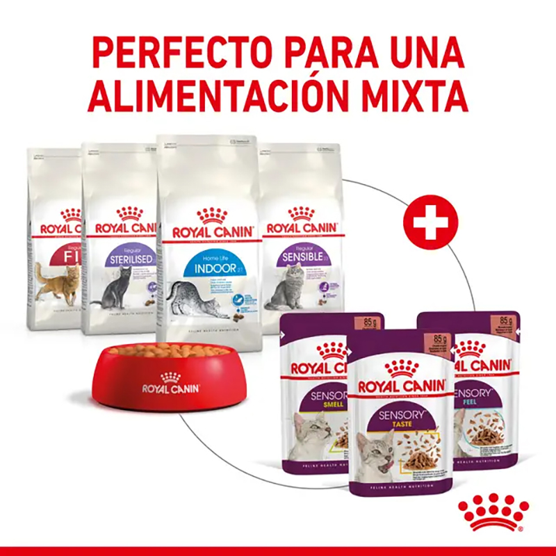 El Royal Canin Sensory Taste en sobre de 85 g ofrece un alimento húmedo en salsa especialmente formulado para gatos adultos a partir de 1 año. Esta receta está diseñada para estimular el sentido del gusto, con una combinación única de sabores que despierta el apetito incluso en gatos exigentes.