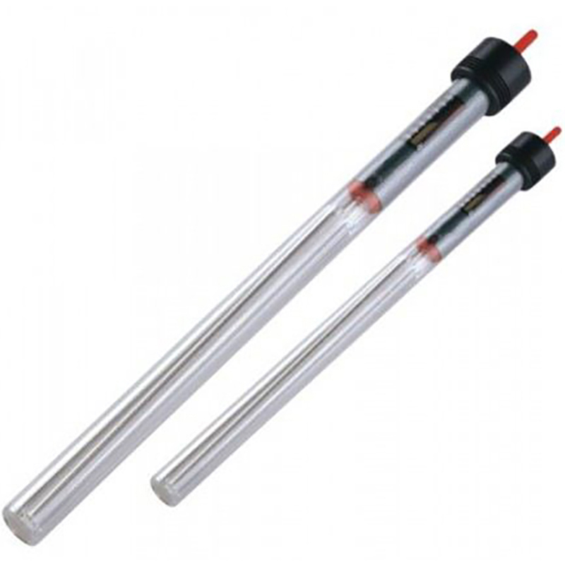 Calentador de acuario. Termostato integrado con indicador de luz de calefacción. Esfera de control de temperatura (ajustable entre 18 y 34 °). Calentador de cristal totalmente sumergible con bobina de calefacción helicoidal de níquel cromado.