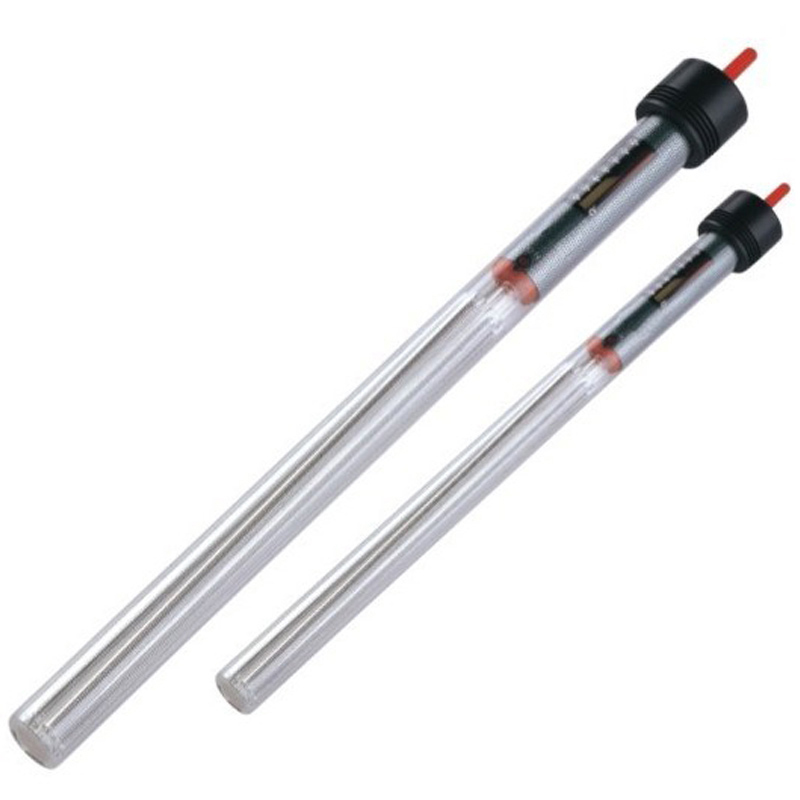 Calentador de acuario. Termostato integrado con indicador de luz de calefacción. Esfera de control de temperatura (ajustable entre 18 y 34 °). Calentador de cristal totalmente sumergible con bobina de calefacción helicoidal de níquel cromado.