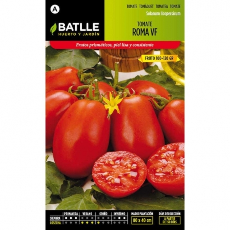 Variedad que tiene gran aceptación en la industria conservera (también usada en el mercado para fresco). Es muy rústica y de gran producción. Frutos prismáticos en forma de pera de color uniforme muy rojo, piel lisa y pulpa consistente. Forma de cultivo : Se siembra se Enero a Mayo en cama caliente, en semillero o en sitios bien resguardados del frío, según climas. Se trasplantan al marco de 70 x 40 cms. cuando las plantitas en semillero han alcanzado el desarrollo adecuado, unos 20 cms. Peso neto : 2. g Nº de semillas en cada sobre : 700 El tomate es una planta herbácea perenne, cultivada como anual, sensible al frío. Las variedades precoces (las que florecen y fructifican más rápido) suelen alcanzar una longitud de 1,2 m las tardías, en cambio, casi siempre son más grandes y llegan a los 2,5 m de longitud. El fruto es una baya. En las especies silvestres de tomate el fruto es bilocular, mientras que en las variedades cultivadas es bilocular o 30-locular, siendo lo más frecuente, de 5 a 9 lóculos. La forma del fruto es variable, generalmente depreso-globoso u oblongo. Presentan numerosas semillas, pequeñas, aplanadas, amarillento-grisáceas, velludas, embebidas en una masa gelatinosa formada por el tejido parenquimático que llena las cavidades del fruto maduro. CONSEJOS GENERALES PARA EL CULTIVO DEL TOMATE Prefiere los suelos fértiles, frescos, humíferos, sueltos, permeables y profundos. Es una planta de clima tropical, por lo que vegeta bien en los climas mediterráneos que casi sin forzar el cultivo se puede cosechar durante todo el año. La temperatura mínima es de 12ºC y la óptima se encuentra centrada entre 18 y 20ºC. La siembra se efectúa en semilleros de bandejas con alveolos principalmente, o con siembra directa, utilizado casi exclusivamente cuando se trata de tomate rastrero para industria. Los semilleros en bandejas se realizan en invernaderos climatizados. El trasplante se realiza a partir del momento que no se prevean heladas en la zona Si son variedades de crecimiento indeterminado se procederá al entutorado de las plantas cuando tengan 20-30 cm. de altura. El marco de plantación oscila entre 40-70 cm. entre plantas y 60-120 cm. entre líneas. Así resultará una población entre 20.000 para variedades de mercado vigorosas y casi 40.000 para variedades de industria de vegetación compacta. Regar inmediatamente después del trasplante, después a los 20-25 días cuando cuajen las primeras flores y a continuación cada 8-10 días aproximadamente. Si se riega a goteo hay que tener en cuenta que las mayores necesidades de agua son a partir del cuajado de frutos. Es una planta que acepta bien los abonados abundantes. Se realizará de fondo a base de N-P-K y Magnesio y durante el cultivo aportaciones de Nitrógeno y Potasio. Cuidar la sanidad del cultivo con esmero sobre todo cuando las condiciones ambientales son algo extremas para su cultivo como alta humedad, temperaturas bajas o muy altas o después de cada poda o recolección que se realizan heridas en la planta. Es aconsejable podar las plantas y hay variedades que es imprescindible. Con ella se consigue aumentar la producción, mayor precocidad, mejor calidad y más facilidad al realizar los tratamientos al no tener tanto follaje. Según el destino de los frutos(mercado para ensaladas, mercado maduro, ramilletes, pa amb tomaquet, industria concentrado, industria pelado, tacos, etc.) y tipo de frutos ( acostillados, redondeados, pera, larga vida, etc.)