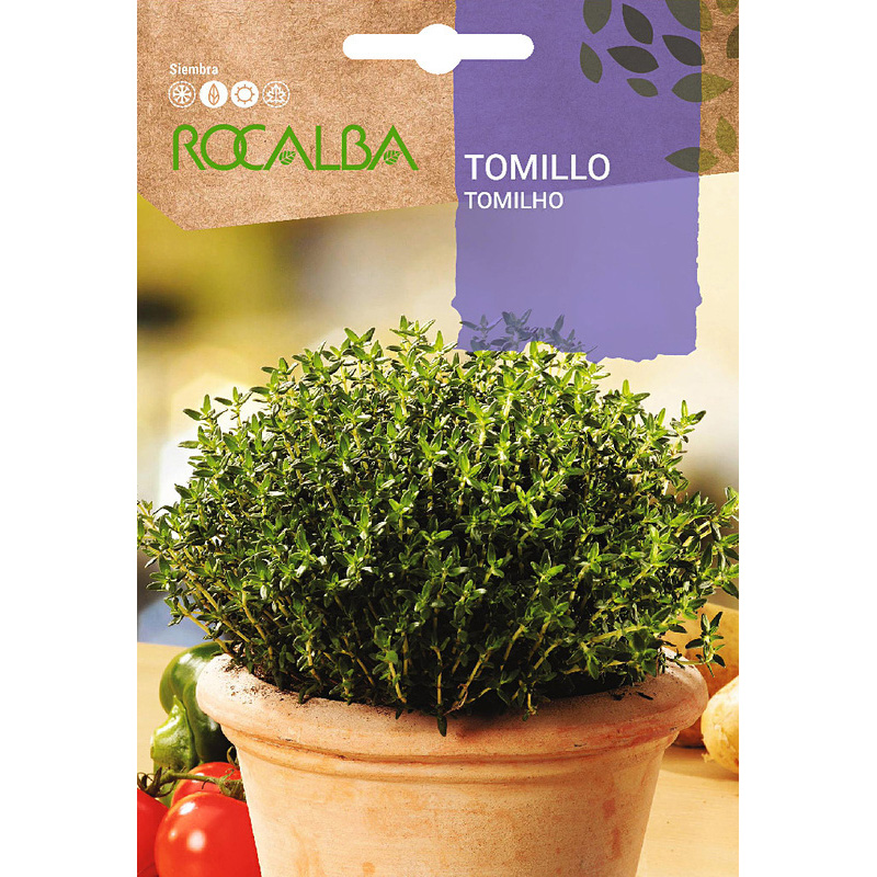 TOMILLO VULGARIS: Pequeño arbusto de unos 25 cm. de altura, de hoja perenne, de color verde oscuro y gris por el envés con flores moradas en pequeños racimos cónicos. Se utiliza como condimento de aplicación muy diversa, en la obtención esencias y por sus propiedades medicinales: estimulante, tónico, antiséptico, antiespasmódico. Cultivo: prefiere ambiente seco y suelos ligeros y soleados