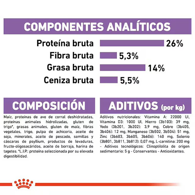 Composición: maíz, proteínas de ave de corral deshidratadas, proteínas animales hidrolizadas, gluten de trigo*, grasas animales, gluten de maíz, fibras vegetales, trigo, pulpa de achicoria, aceite de soja, sustancias minerales, aceite de pescado, semillas y cáscaras de psyllium, productos de levaduras, fructo-oligosacáridos, aceite de borraja, harina de tagetes.